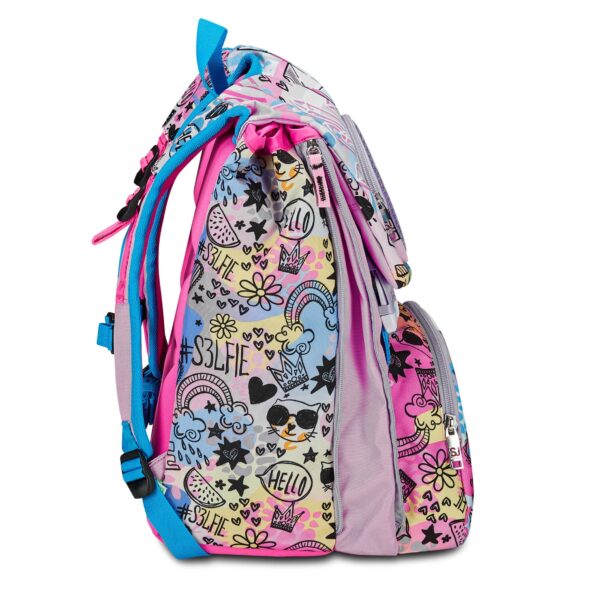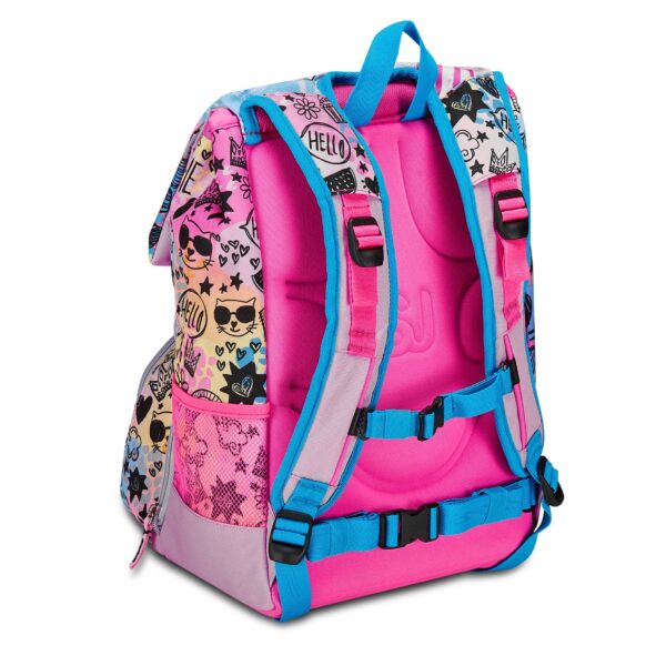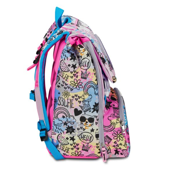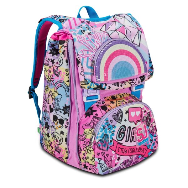 - Altre caratteristiche: Zaino estensibile tramite zip laterali, inserti rifrangenti, tasca sagomata a forma di arcobaleno sulla pattina con paillettes trasparenti e chiusura con zip, cinghia a vita amovibile e cinghia torace, modello certificato IGR per design ergonomico